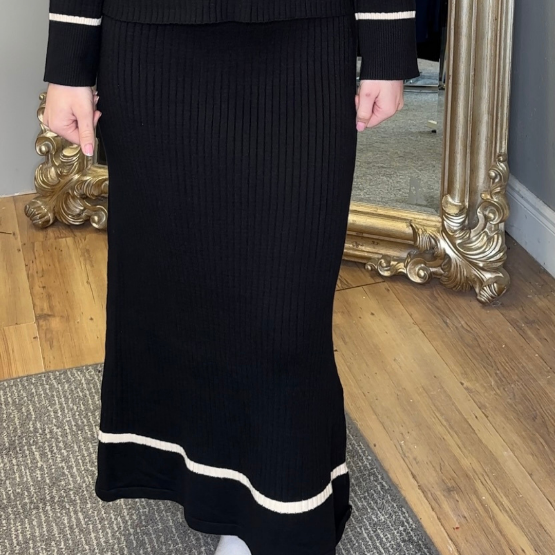 Our Black Ribbed Coord Set is the perfect duo for polished, everyday wear. Featuring a long-sleeved top and matching midi skirt, with White Stiped Detailing this set combines comfort with sleek, modern design. The soft Black knit is designed with a midi-length skirt for a flattering, streamlined silhouette. Ideal for layering or wearing as a complete set, this coordinated outfit offers comfort without compromising on style.