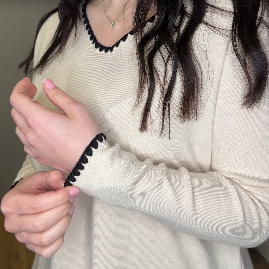 Chic, comfy and easy to wear, our cream Co-Ord with black Scallop Edge is the perfect throw  on and go set. Featuring a long-sleeved top and matching trousers, the soft cream fabric is finished with black scallop trim for a gorgeous contrast detail. Dress it up or keep it casual, it’s an effortless look you’ll reach for again and again.