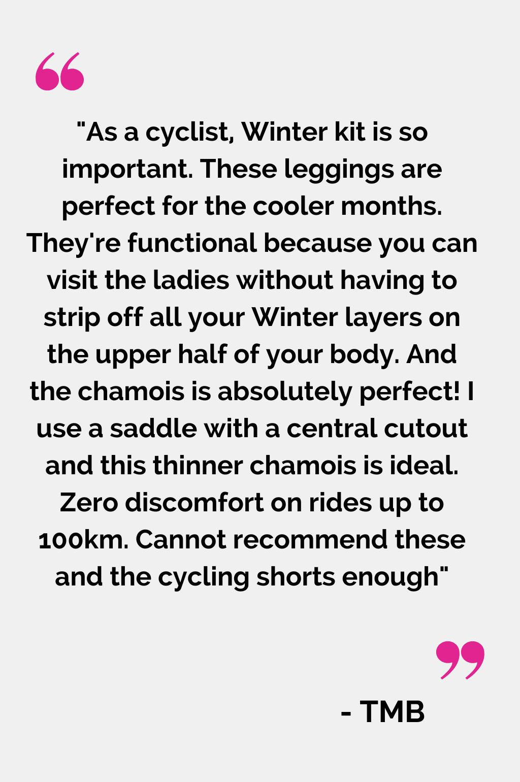 As a cyclist, Winter kit is so important. These leggings are perfect for the cooler months. They're functional because you can visit the ladies without having to strip off all your Winter layers on the upper half of your body. And the chamois is absolutely perfect! I use a saddle with a central cutout and this thinner chamois is ideal. Zero discomfort on rides up to 100km. Cannot recommend these and the cycling shorts enough.