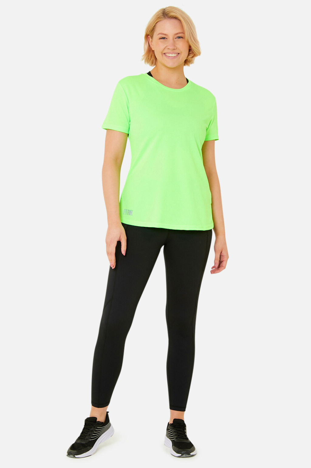 Cusomer feedback about the lightweight sports t-shirt in Lime : 'Beautiful material that is perfect for a walk, run, dumbbell exercises, and CrossFit training''Lovely and light for workouts. Cant wait to buy more'