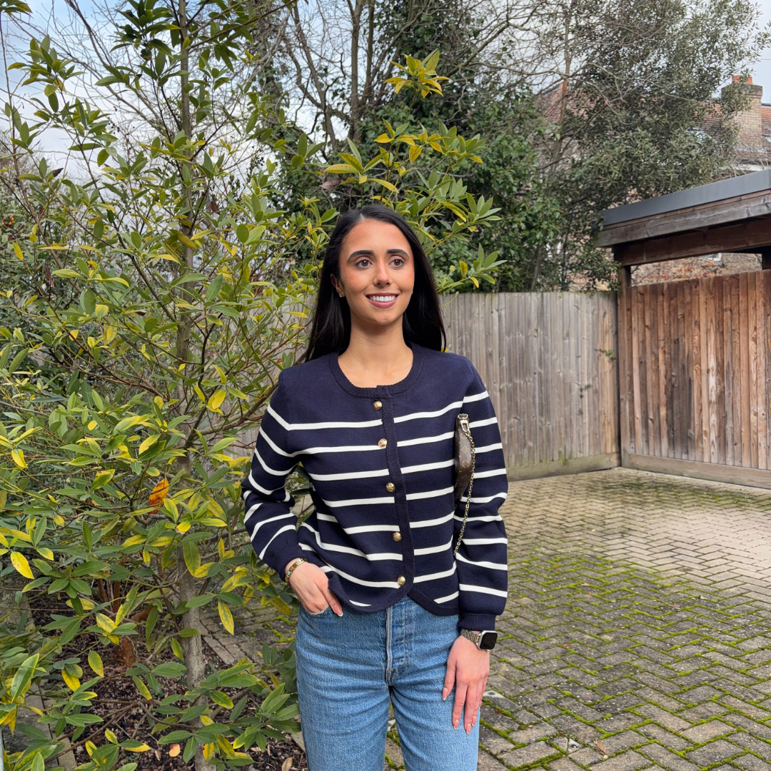 Fresh, timeless and effortlessly elegant, our Navy & White Stripe Button Knit Cardigan is the perfect blend of comfort and classic style. Designed in a relaxed fit, the soft navy knit is elevated with clean white stripe detailing and finished with statement gold buttons for a polished look. Lightweight yet cosy, it’s ideal for layering across seasons and pairs perfectly with jeans, leggings or Slim or Straight Leg Pants.